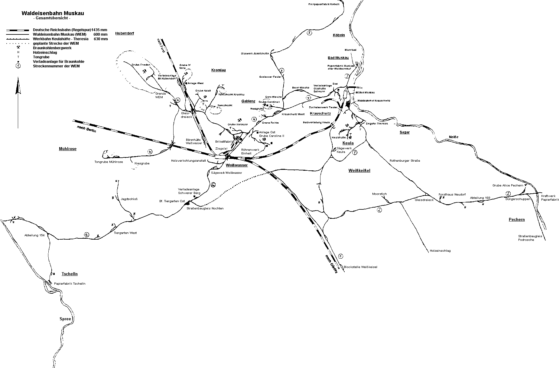 -1966 wurde die damalige Strecke 4 der Waldeisenbahn verlängert, um den Neuaufschluss des Tonschachtes Mühlrose zu erreichen -diese 5,5 Kilometer, einschließlich des Halbendorfer Wechsels, waren der letzte Streckenneubau der WEM und wurde am 15. Oktober 1966 von der DR übernommen -ab dem 1. Januar 1978 betrieb die Ziegelei Weißwasser die 12,1 km lange Strecke bis Mühlrose mit zwei V10C-Loks und WEM-Wagen der Reihe 01T -durch die Einstellung der Produktion in der Ziegelei Weißwasser im Jahre 1991 wurde auch die Werkbahn stillgelegt -die Strecke befand sich in einen schlechten Zustand, nach der Einstellung des Betriebs breitete sich die Vegetation auf der Strecke aus -die Strecke wurde unter Denkmalschutz gestellt und gelangte in das Eigentum des Landkreises Weißwasser, so konnten erste Instandsetzungsmaßnahmen durch den Verein WEM e.V. vorgenommen werden -seit Mai 1997 wurden in großen Arbeitseinsätzen, auch mit ABM-Unterstützung, die Strecke von jahrelangem Bewuchs befreit, Bü-beschilderungen erneuert bzw. aufgearbeitet, Dammunterspülungen beseitigt, beschädigte Schwellen und Kleineisen gewechselt, fehlende Weichen an der Trebendorfer Wasserstelle und der Übergabestelle Mühlrose eingebaut und das Gleis im Bereich der Forster Unterführung gehoben und trockengelegt -für Sonderfahrten bis zum Halbendorfer Wechsel ist die Strecke heute befahrbar -dabei werden das im Jahr 2000 wieder aufgebaute Anschlussgleis zur ehemaligen Grube Adolf und die Forster Unterführung mit dem Restloch der Grube Phillippine befahren |