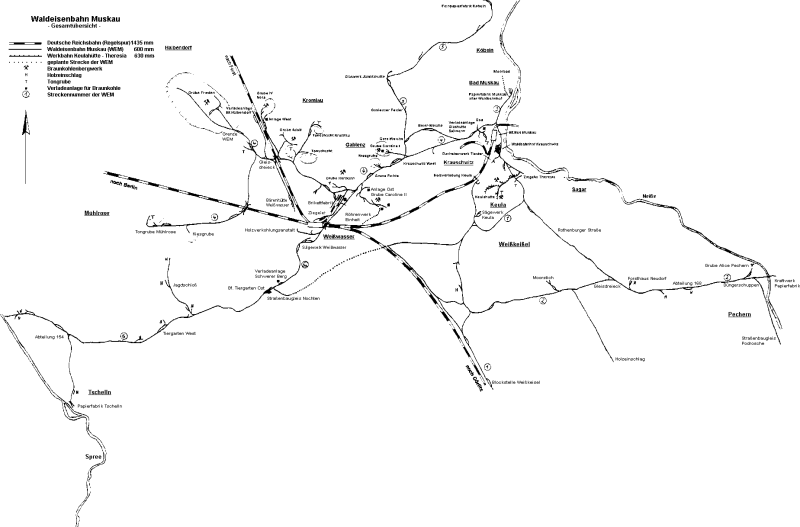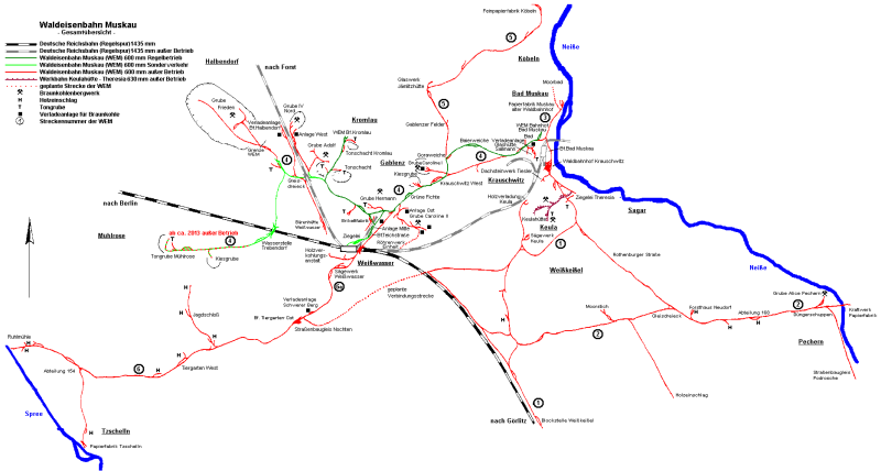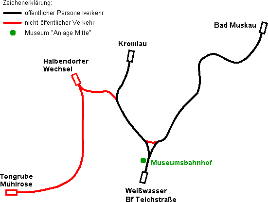 Faltenbogens und Anbindung der Ende des 19. Jahrhunderts entstandenen Braunkohlegruben, Ziegeleien, Sägewerke, Papierfabriken und Glashütten im Gebiet zwischen Muskau und Weißwasser eine Werksbahn mit 600 mm Spurweite vom damaligen Besitzer, der Standesherrschaft Muskau, Graf Hermann von Arnim -1896 kaufte die Gräflich von Arnimsche Kleinbahn ihre ersten beiden Dampflokomotiven und erweiterte das Gebiet bis zur Jahrhundertwende auf über 50 km -bis 1919 erwarb die Bahn weitere Dampflokomotiven zu ihrem Wagenpark aus Kipploren, Kohle-, Holz- und Plattformwagen -etliche Loks und Wagen aus den Beständen der ehemaligen Deutschen Heeresfeldbahnen kamen nach Ende des 1. Weltkrieges zur WEM -die sogenannten Brigadeloks bildeten bis zur Einstellung des Güterverkehrs Ende der 1970er Jahre das Rückgrad des Bahnbetriebes -viele Brigadewagen wurden in der eigenen Werkstatt in Kohle- und Tonwagen umgebaut -1939 hatte die WEM 11 Dampfloks, mehrere Dieselloks und über 550 Wagen -wegen Beschädigungen an Fahrzeugen, Gleisen und umliegenden Betrieben, sowie infolge Reparationsleistungen war der Start nach dem 2. Weltkrieg zunächst schwierig -durch fehlen von LKWs war die WEM zum Wiederaufbau der Industrie im Kreis Weißwasser jedoch unersetzbar geworden und 1951 übernahm die Deutsche Reichsbahn die Anlagen und den Betrieb -bis in die 1970er Jahre wurden noch große Mengen an Kohle zu den Fabriken gefahren, Moor für das Moorbad geliefert und mehrere Ziegeleien mit Ton versorgt -Untersuchungen zu Beginn der siebziger Jahre stellten die Wirtschaftlichkeit der Bahn in Frage und so wurde der Betrieb schrittweise eingestellt -nur die Ziegelei in Weißwasser führte auf einer 12 km langen Reststrecke noch Werksverkehr mit Dieselloks vom Typ V 10 C durch -die restlichen Gleise wurden abgebaut und viele Wagen verschrottet -die meisten Dampflokomotiven und einige Wagen wurden an Museumsbahnen verkauft -Lok 99 3312 gelangte als Denkmal nach Oberoderwitz und 99 3317 wurde in einem Wohngebiet von Weißwasser auf einen Sockel gestellt -1984 fanden sich Eisenbahnfreunde aus dem Raum Weißwasser mit dem Ziel zusammen, Sachzeugen der WEM zu erhalten und begannen damit Wagen wiederaufzuarbeiten und auf der Tonbahn Sonderfahrten durchzuführen -weil die als Unterbringungsort genutzte Ziegelei Weißwasser der Platz zu klein war, wurde 1988 ca. 300m vor der Ziegelei mit dem Bau des heutigen Bahnhof Weißwasser Teichstraße begonnen -nach der politischen Wende in der DDR stellte die Ziegelei ihren Betrieb ein, 1990 übernahm der neugegründete Verein Waldeisenbahn Muskau e. V. die Tonbahn zum Schacht Mühlrose -im selben Jahr kam die Denkmallok 99 3317 zurück zur WEM -1991 wurde vom Landratsamt Weißwasser beschlossen die Waldeisenbahn mit Hilfe von Fördermitteln und Arbeitsbeschaffungsmaßnahmen als Touristenattraktion wieder aufzubauen -schon 1992 ging die strecke zum Park nach Kromlau, zunächst mit Diesellokomotiven von stillgelegten Werkbahnen und für den Personenverkehr umgebauten offenen Güterwagen in Betrieb -in der eigenen Werkstatt entstanden zusätzlich gedeckte Personenwagen -aus marktwirtschaftlichen gegebenheiten bildete sich 1993 die Gesellschaft zur Betreibung der Waldeisenbahn Muskau mbH -99 3312 kam 1994 im Tausch gegen eine polnische Lok zurück zur Waldeisenbahn -seit 1995 ist die alte Strecke zwischen Weißwasser und Bad Muskau wieder aufgebaut -die 99 3317 wurde wieder betriebsfähig aufgearbeitet -auf einem angekauften Gelände endstand von 1996 bis 2002 ein Abstellbahnhof mit dreigleisiger Wagenhalle, der "Museumsbahnhof Anlage Mitte" -seit 1998 fährt auch die 99 3312 "Diana" wieder, womit nun zwei betriebsfähige Dampflokomotiven bei der WEM im Einsatz sind |